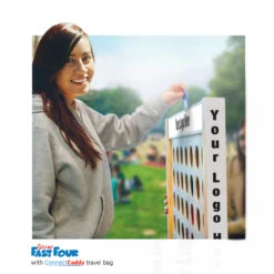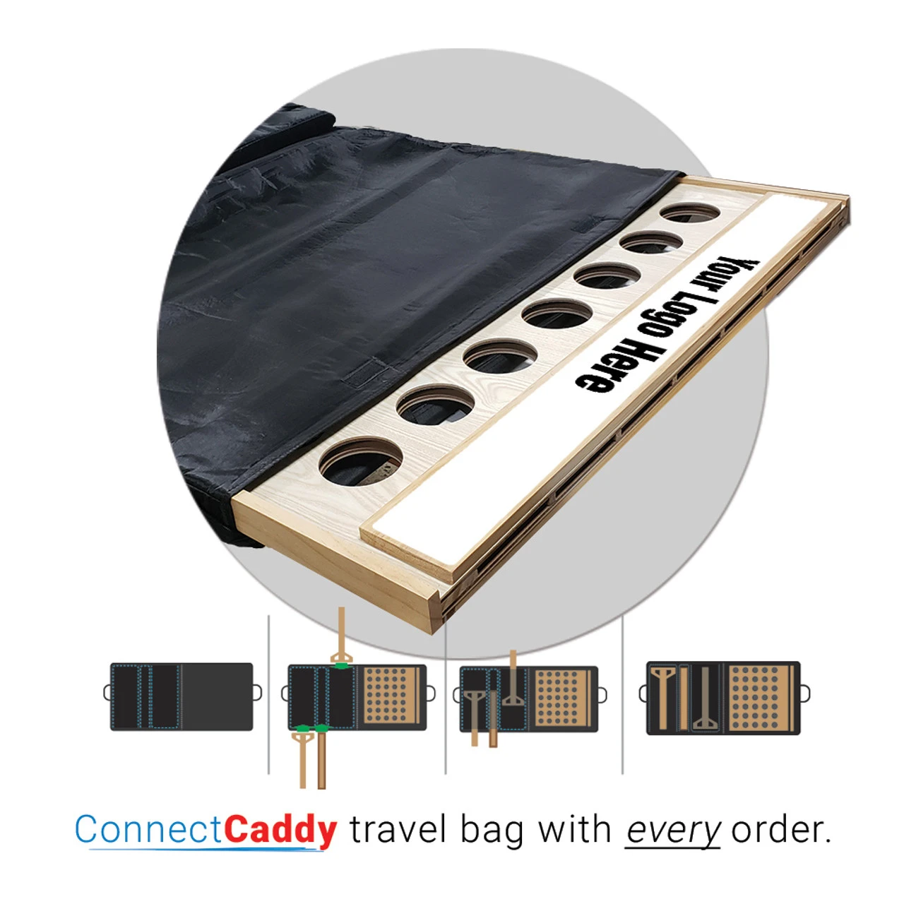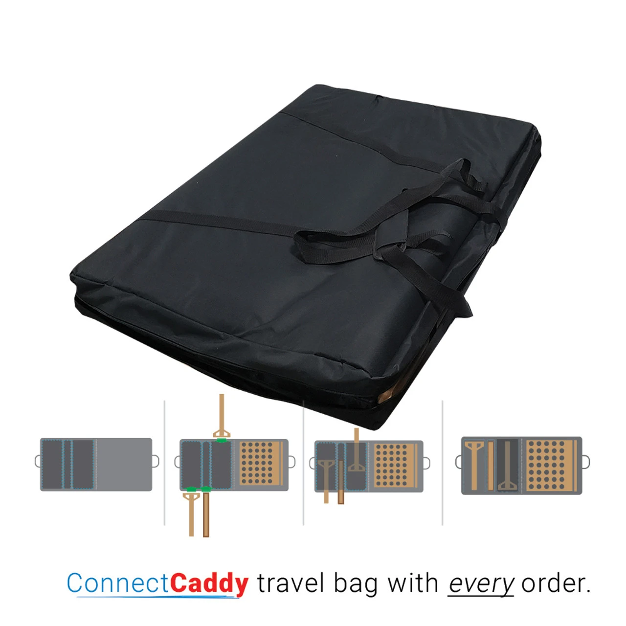 Super-size your backyard with the Giant Connect Four and we’ll super-size the offer- for a limited time, we are giving away our Connect Caddy travel bag with EVERY order. The Connect Caddy travel bag is capable of stowing and carrying the entire game, once disassembled. Construction highlights include a durable, cotton-poly blend material with poly-blend webbing (straps) and a 3-sided zipper for accessing the contents of the game. The game is removed by placing the case on the ground, unzipping the primary zipper and opening the case like a book until both sides are flat on the ground. Pieces of the game can then be removed by the reinforced and padded pockets designated for each piece. Pockets include extra padding and attached velco straps for securing each pocket. Order a Giant Connect Four game and receive our Connect Caddy travel bag for free.