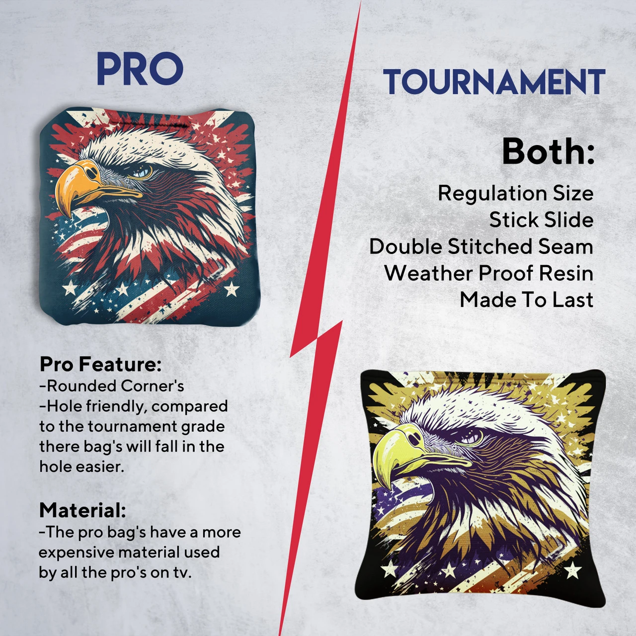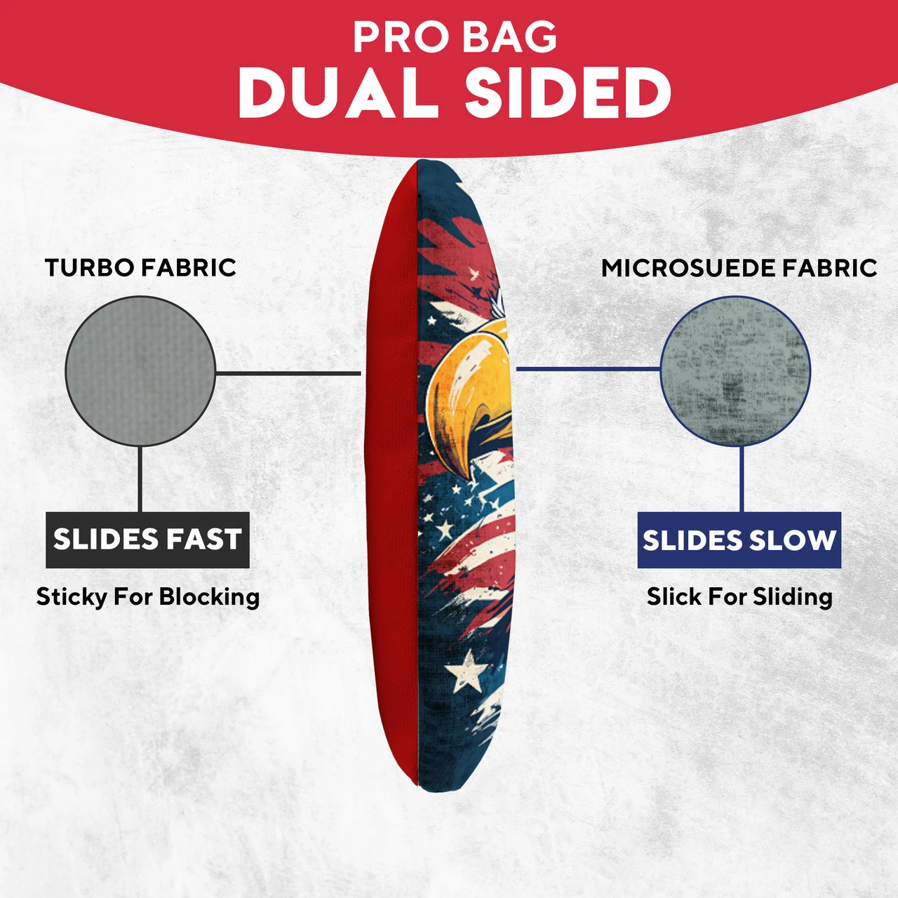 Professional Regulation Cornhole Bags’ dual-sided material construction advances playing strategy and control, allowing you to grab or glide on the board. With various graphic options available, sets can be mixed and matched to fit any style.