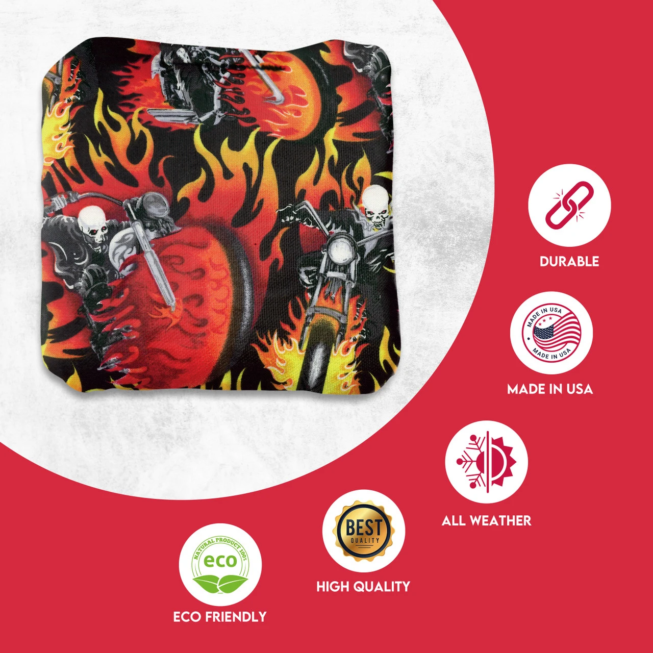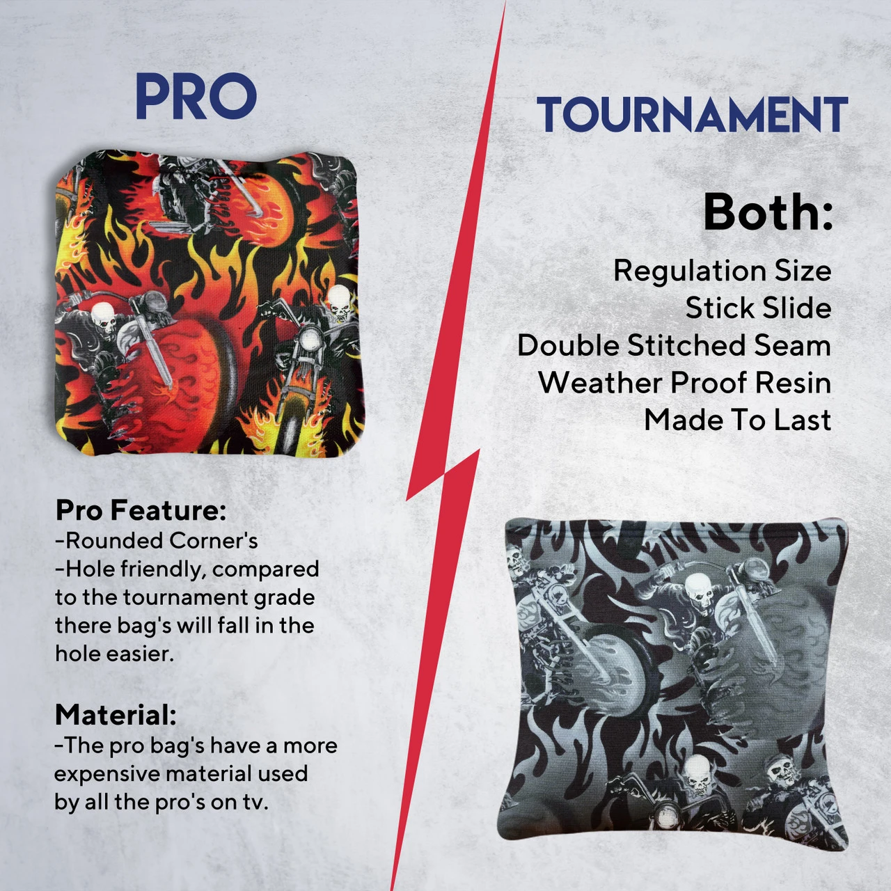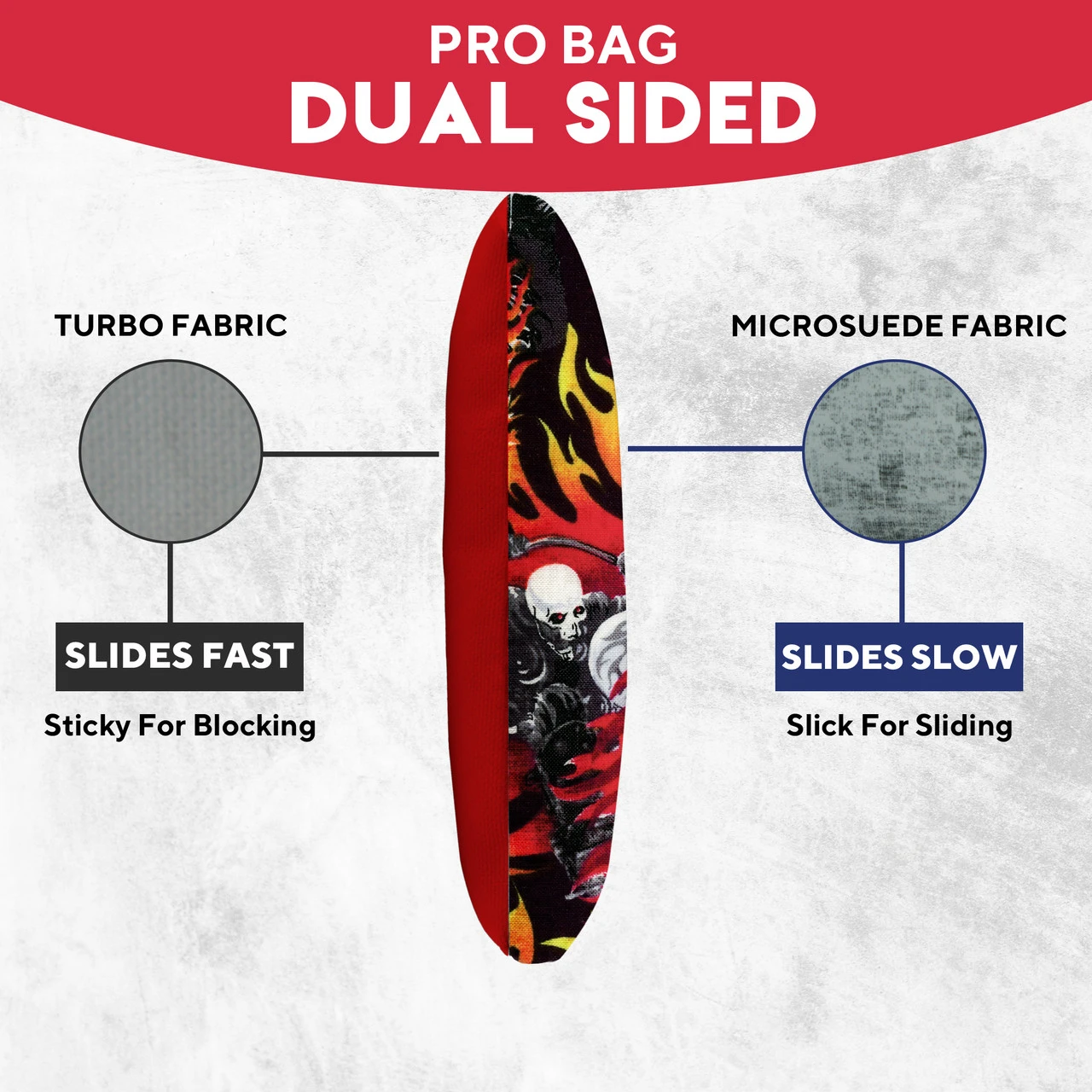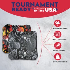 Professional Regulation Cornhole Bags’ dual-sided material construction advances playing strategy and control, allowing you to grab or glide on the board. With various graphic options available, sets can be mixed and matched to fit any style.